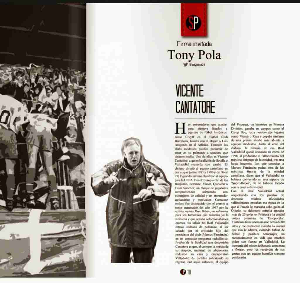 En el siguiente artículo podremos leer la opinión del periodista Tony Pola en la revista Spanish Player GO sobre el pasado de Vicente Cantatore y el Europucela, incluyendo también lo que actualmente se piensa en Zorrilla que no es otra idea que la de rendir un homenaje al gran Don Vicente. En el siguiente link puedes encontrar el artículo íntegro, y si lo quieres leer desde nuestra página basta con pinchar sobre la foto y ampliar imagen.