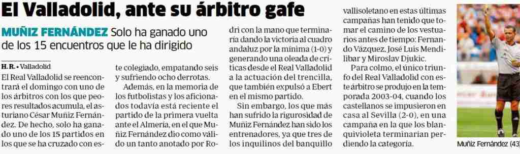 El Real Valladolid se reencontrará el domingo con uno de los árbitros con los que peores resultados acumula, el asturiano César Muñiz Fernández. De hecho, solo ha ganado uno de los 15 partidos en los que se ha cruzado con este colegiado, empatando seis y sufriendo ocho derrotas.