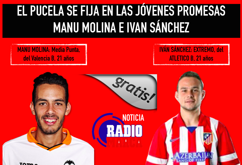 Ambas noticas las ha narrada Chus Rodriguez en Radio Marca Valladolid, y desde Pucela Fichajes podemos asegurar que desde el Pucela se está trabajando para traer a ambos futbolistas.  Iván Sánchez del Atlético de Madrid B termina contrato en junio de 2014, ocupa la demarcación de extremo izquierdo y tiene 21 años, el problema es que el Almería también ha preguntado por su situación. Manu Molina también termina contrato con el Valencia B en este mes de Junio, ocupa la posición de media punta y tiene 21 años.