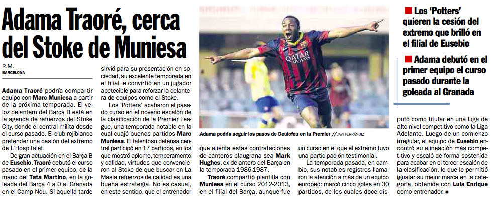 Adama Traoré podría compartir equipo con Marc Muniesa a partir de la próxima temporada. El veloz delantero del Barça B está en la agenda de refuerzos del Stoke City, donde el central milita desde el curso pasado. El club rojiblanco pretender una cesión del extremo de L’Hospitalet.