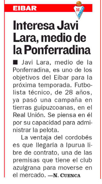 Javi Lara, medio de la Ponferradina, es uno de los objetivos del Eibar para la próxima temporada. Futbolística técnico, de 28 años, ya pasó una campaña en tierras guipuzcoanas, en el Real Unión. Se piensa en él por su capacidad para administrar la pelota.