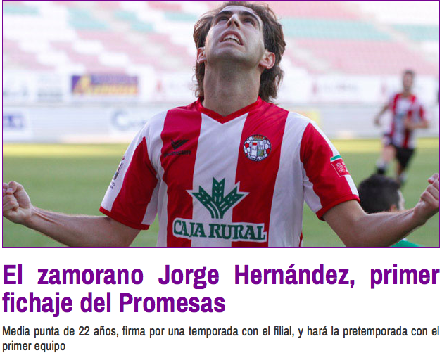 El media punta Jorge Hernández Diéguez (Sanzoles, Zamora, 06-02-1992), media punta formado en las categorías inferiores del Zamora C.F., es el primer refuerzo del Real Valladolid B para la próxima temporada, con opción a ampliar este compromiso por más campañas.