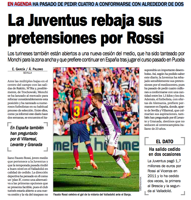 Ante las múltiples bajas en el centro del campo con las salidas de Rakitic, M’Bia y, posiblemente, de Trochowski, Monchi se ha lanzado al mercado para reforzar considerablemente esta posición y ha tanteado a numerosos futbolistas en su habitual proceso de selección. Entre ellos, como ya informó este diario hace dos semanas, se encuentra el italiano Fausto Rossi, joven medio que pertenece a la Juventus y que la temporada pasada rindió a buen nivel en el Valladolid en calidad de cedido. La dirección deportiva ha pensado en él como un ‘plan B’, como una alternativa a las primeras opciones que se presenta factible, pues el club turinés estaría abierto a una nueva cesión y la vía del traspaso no
