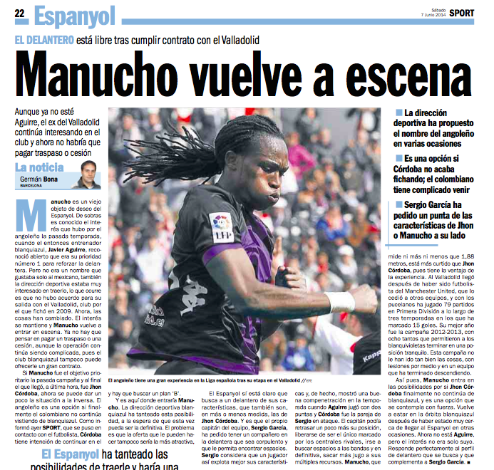 De ahí la idea de fichar a Manucho aunque el problema del Espanyol esEque su contrato no sería muy atractivo por la economía del club.