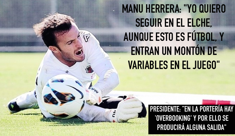 El presidente del Elche es consciente de que «en la portería hay ‘overbooking’ y que por ello se producirá alguna salida». Hay que recordar que ha llegado el portero polaco Przemyslaw Tyton en este mercado de invierno, por lo que actualmente con la llegada de Tyton, el Elche cuenta con cuatro porteros Manu Herrera, Toño Rodríguez, Diego Rivas y el mencionado Tyton. Lo normal es que salgan dos porteros del equipo. En las próximas horas sabremos que dos guardametas salen del conjunto ilicitano. El Real Valladolid tiene en su agenda a Manu Herrera para sustituir la baja de Jaime.