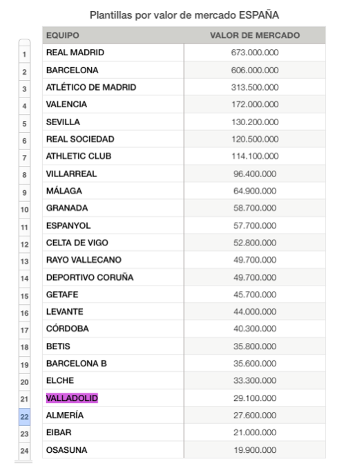 Este valor de mercado, la página TRANSFERMARKT lo calcula según valoran el precio de los futbolistas del Real Valladolid que tendrían en el mercado actual según su estado actual, edad y división en la que se encuentren. La lista la encabeza el Real Madrid con 673 millones, seguido muy de cerca por el Barcelona con 606 millones. El tercero y bastante alejado del cuarto es el Atlético de Madrid con 313,5 millones. Valencia, Sevilla, Real Sociedad y Athletic Club son los siguientes con valores muy cercanos entre ellos. En la zona media el ganador de este ranking sería el Villarreal con casi 100 millones, seguido por Málaga, Granada , Espanyol, Celta de Vigo que todos sobrepasan los 50 millones. Desde los 40 millones hasta casi los 50, se encuentran varios equipos: Rayo Vallecano, Deportivo de la Coruña, Getafe, Levante y Córdoba. Y ya luego en las siguientes posiciones se alternan equipos de primera con equipos de segunda: Betis, Barcelona B, Elche, Valladolid, Almería, Eibar y Osasuna.