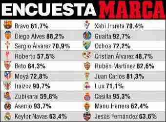 Los internautas de MARCA.com eligieron los porteros titulares de los veinte equipos de la Liga BBVA. Los aficionados consideran que Xabi Irureta (70,4%) debe ocupar la portería del Eibar por delante de Jaime Jiménez (29,6%). El otro que proponen es al ex canterano del Real Madrid, Jesús Fernández  (63,6%) por por delante de Diego Mariño (37,4%) en el Levante.