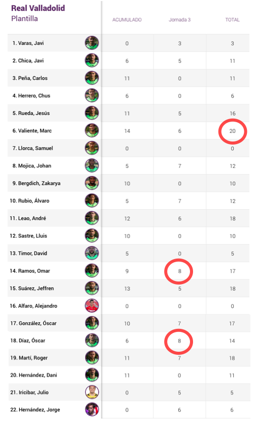 Los 3 mejores del partido que enfrentaba al Pucela con el Racing han sido los siguientes: Omar con 8 puntos, Óscar Díaz con 8 y Álvaro Rubio con 7. Seguidos también con 7 puntos: Mojica, Óscar y Roger.
