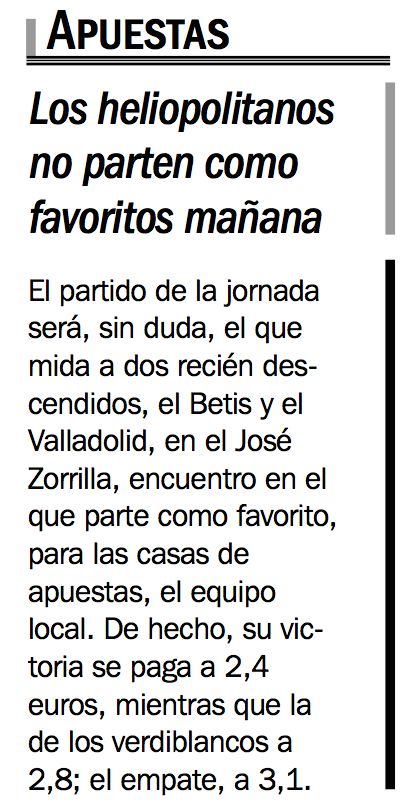 El partido de la jornada será, sin duda, el que mida a dos recién descendidos, el Betis y el Valladolid, en el José Zorrilla, encuentro en el que parte como favorito, para las casas de apuestas, el equipo local. De hecho, su victoria se paga a 2,4 euros, mientras que la de los verdiblancos a 2,8; el empate, a 3,1.