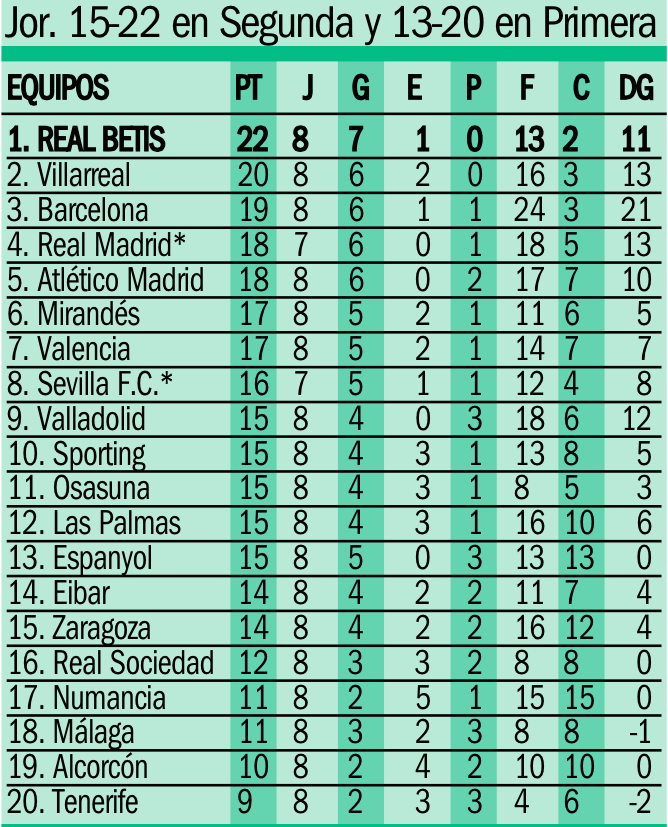 ESTADIO DEPORTIVO, periodico deportivo de la ciudad de Sevilla ha elaborado una clasificación de las últimas jornadas entre los equipos de la primera y segunda división, en la que el Real Valladolid se encuentra en el TOP 10, encabezada por el Real Valladolid tras una magnífica racha del equipo tras la salida del ex Pucela Julio Velazquez. El Real Valladolid es el tercer equipo de segunda con mejor bagaje de Segunda en estas 8 jornadas, solo por detrás del ya nombrado Betis y del Mirandés.