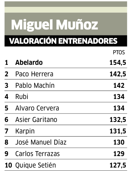 El entrenador del Real Valladolid, tras ganar al Mallorca esta jornada por 1-5 se coloca cuarto en la clasificación «Miguel Muñoz» de MARCA que califica a los entrenadores para al final de temporada nombrar a uno de ellos como el mejor de la categoría. Hasta la fecha, el entrenador más valorado y con 20 puntos más que Rubi, es Abelardo (entrenador del Sporting de Gijón).