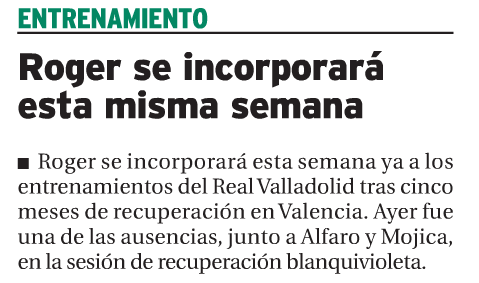 Roger se incorporará esta semana ya a los entrenamientos del Real Valladolid tras cinco meses de recuperación en Valencia. Ayer fue una de las ausencias junto a Alfaro y Mojica, en la sesión de recuperación blanquivioleta.
