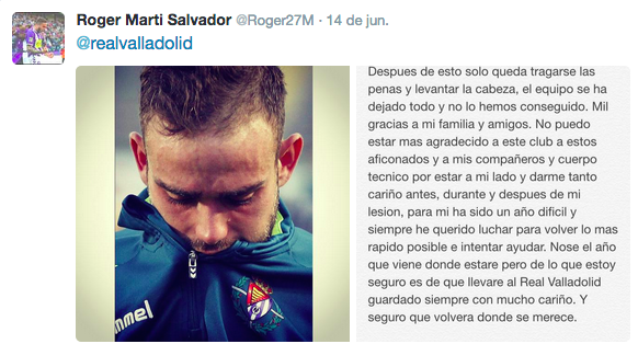 Roger Martí ha calado en la afición del Real Valladolid tras una buena temporada en el club pese a estar lesionado gran parte de ella, pero desde el primer momento conecto con los aficionados del Pucela, a través de su cuenta de twitter ha querido agradecer su año, y entre esos agradeciemientos lógicamente se encuentra el Real Valladolid: «Después de esto solo queda tragarse las penas y levantar la cabeza, el equipo se ha dejado todo y no lo hemos conseguido. No puedo estar más agradecido a este club, a estos aficionados y a mis compañeros y cuerpo técnico por estar a mi lado y darme tanto cariño antes, durante y después de mi lesión. Para mí ha sido un año difícil y siempre he querido luchar para volver lo más rápido posible e intentar ayudar. No sé el año que viene dónde estaré pero de lo que estoy seguro es de que llevaré al Real Valladolid guardado siempre con mucho cariño. Y seguro que volverá donde se merece»
