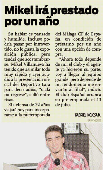 Según declara el DIARIO DE LARA venezolano, el lateral izquierdo Mikel Villanueva pretendido por el Real Valladolid acabará CEDIDO una temporada en el Málaga, aunque el espera no tener que volver a su país porque eso significará que el Málaga se ha hecho con sus servicios. El Málaga tendrá una opción de compra por el venezolano a final de campaña. En principio la pretemporada la va hacer con el primer equipo y según sus evoluciones podría quedarse o bajado al filial de la tercera división española.