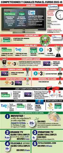 El heterogéneo reparto de los derechos televisivos del fútbol ha dejado un mosaico de televisiones y canales que ofrecerán a los telespectadores la posibilidad de ver todos los partidos de las competiciones europeas. Desde ‘Mundo Deportivo’ han facilitado una sencilla infografía donde se aprecia cómo y en qué televisiones se pueden ver y contratar los partidos de esta temporada 2015-2016: