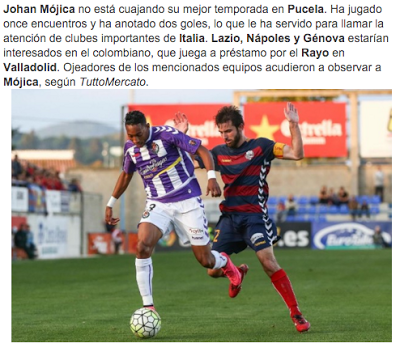 Johan Mójica no está cuajando su mejor temporada en Pucela. Ha jugado once encuentros y ha anotado dos goles, lo que le ha servido para llamar la atención de clubes importantes de Italia. Lazio, Nápoles y Génova estarían interesados en el colombiano, que juega a préstamo por el Rayo en Valladolid. Ojeadores de los mencionados equipos acudieron a observar a Mójica, según TuttoMercato.