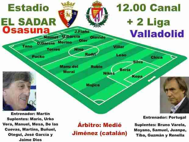 Veremos que once saca un Martín que esta semana ha jugado al despiste más que nunca. Incluso da la impresión de que lo ha hecho este mismo sábado poniendo en los equipos titulares de los ensayos a jugadores que después ha dicho que no los ve como para jugar de inicio y hasta algunos que pueden quedar fuera de la convocatoria. Puede ser un sistema de 5-1-3-1 o un 4-1-4-1. Cualquier cosa puede pasar como en el caso de un Jaime Díos del que primero ha dicho que puede ser titular o irse a jugar a Olite con el Promesas aunque posteriormente ha descartado lo primero para darle como mejor opción la de estar en el banquillo. Es obligado esperar hasta que una hora antes el partido el técnico de el once y después ver cómo coloca a sus jugadores en el césped.