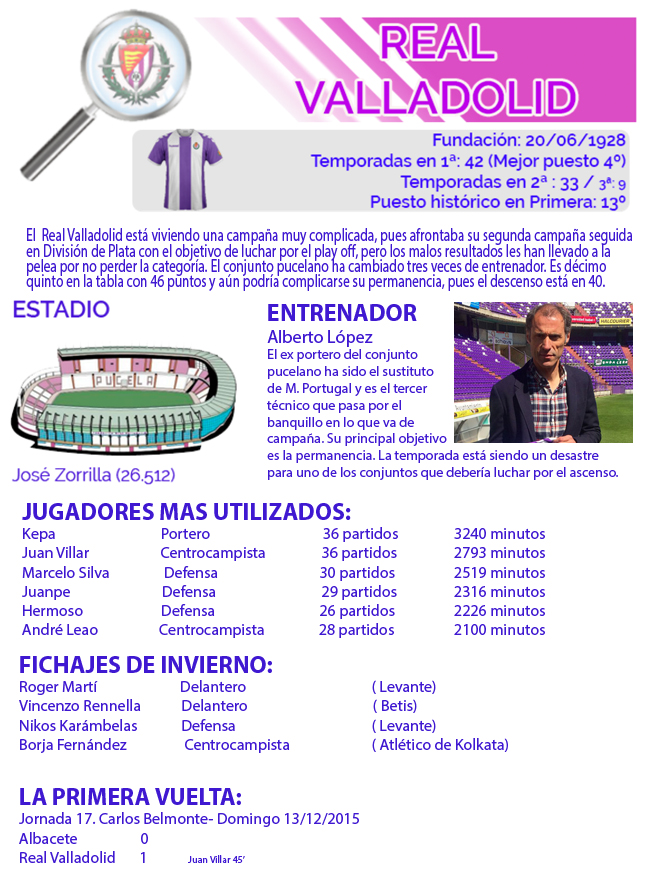 En el siguiente Link: http://www.aupaalba.es/albacete/analisis-del-rival/2216-el-rival-real-valladolid-2 puedes ver el análisis de como desde Albacete ven al Real Valladolid. Con el cambio de entrenador y estadísticas pucelanas.