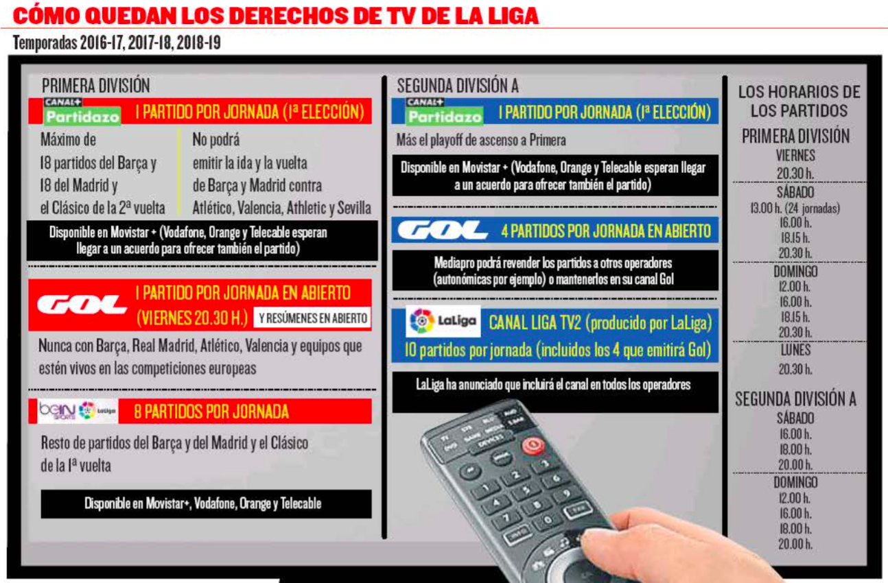 Mediapro ya se quedó ocho partidos de pago para emitirlos en beIN LaLiga en todos los operadores con la novedad de 24 partidos los sábados a las 13 h. Barça y Madrid jugarán alguna vez y casi siempre entre las 16.00, 18.15 y 20.30 h.. Movistar + adquirió el ‘Partidazo’ (18 máximo de Barça, 18 de Madrid y el Clásico de la segunda vuelta). Vodafone, Orange y Telecable confían en llegar a un acuerdo para emitirlo. Y en cuanto a la Segunda A, habrá cuatro duelos en abierto en Gol, el mejor de cada jornada en Movistar + y el resto, en el canal LaLigaTV2 que producirá la propia Liga y se ofrecerá a todos los operadores. En el siguiente gráfico se detalla cómo se distribuirán los partidos y las franjas horarias en Primera y Segunda para cada jornada.