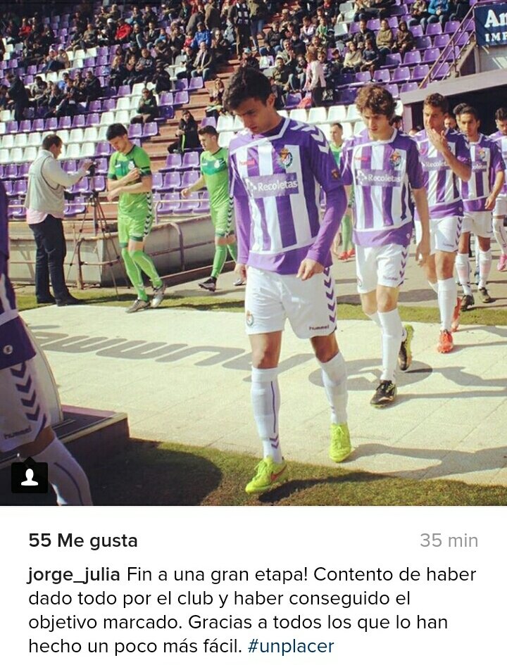 El futbolista del Real Valladolid Promesas Jorge Juliá a través de las redes sociales también se ha querido despedir brevemente del Real Valladolid, ya que por sus palabras no continuará en Pucela la próxima campaña: «Fin a una gran etapa! Contento de haber dado todo por el club y haber conseguido el objetivo marcado. Gracias a todos los que lo han hecho un poco más fácil. #unplacer».