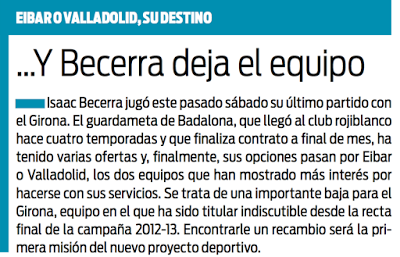 Isaac Becerra jugó este pasado sábado su último partido con el Girona. El guardameta de Badalona, que llegó al club rojiblanco hace cuatro temporadas y que finaliza contrato a final de mes, ha tenido varias ofertas y, finalmente, sus opciones pasan por Eibar o Valladolid, los dos equipos que han mostrado más interés por hacerse con sus servicios. Se trata de una importante baja para el Girona, equipo en el que ha sido titular indiscutible desde la recta final de la campaña 2012-13. Encontrarle un recambio será la primera misión del nuevo proyecto deportivo.