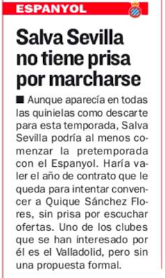 Hoy el Diario AS informa que pese a que el Real Valladolid tiene en mente a Salva Sevilla para reforzar el centro del campo, por ahora no existe propuesta formal del club pucelano por el futbolista. Aunque el jugador aparecía en todas las quinielas como descarte para esta temporada, Salva Sevilla podría al menos comenzar la pretemporada con el Espanyol. Haría valer el año de contrato que le queda para intentar convencer a Quique Sánchez Flores, sin prisa por escuchar ofertas. Uno de los clubes que se han interesado por él es el Real Valladolid, pero sin una propuesta forma.