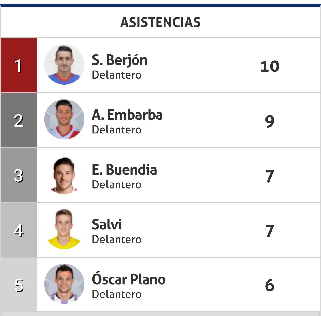 Saúl Berjón (10), Embarba (9), Buendía (7) y Salvi (7) superan a Plano en esta clasificación.