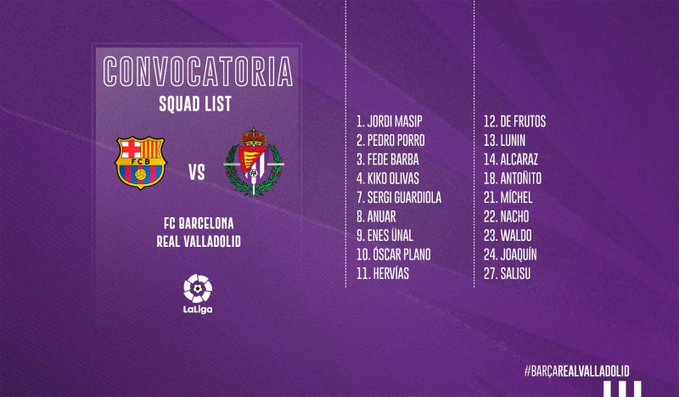 La convocatoria completa para jugar contra el Barcelona en el Camp Nou la conforman: Masip, Lunin, Antoñito, Pedro Porro, Kiko Olivas, Joaquín, Salisu, Fede Barba, Nacho, Anuar, Míchel, Alcaraz, Waldo, Óscar Plano, Hervías, Sergi Guardiola y Enes Ünal.
