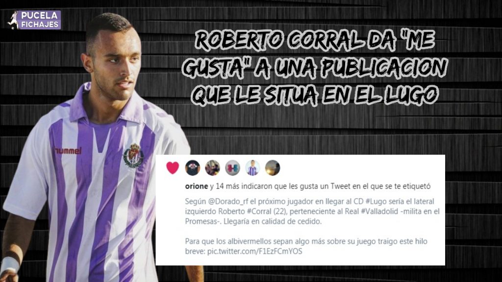 Las horas de Roberto Corral en el Real Valladolid podrían estar contadas, el lateral zurdo recalará con casi total seguridad en el Lugo y será el año de su debut en la Categoría de Plata. El propio futbolista en una publicación de twitter en la que le sitúan en el club gallego ha dado a «Me Gusta» . Corral será el segundo jugador del Promesas que recale en el club lucense, sumándose a Diego Alende.