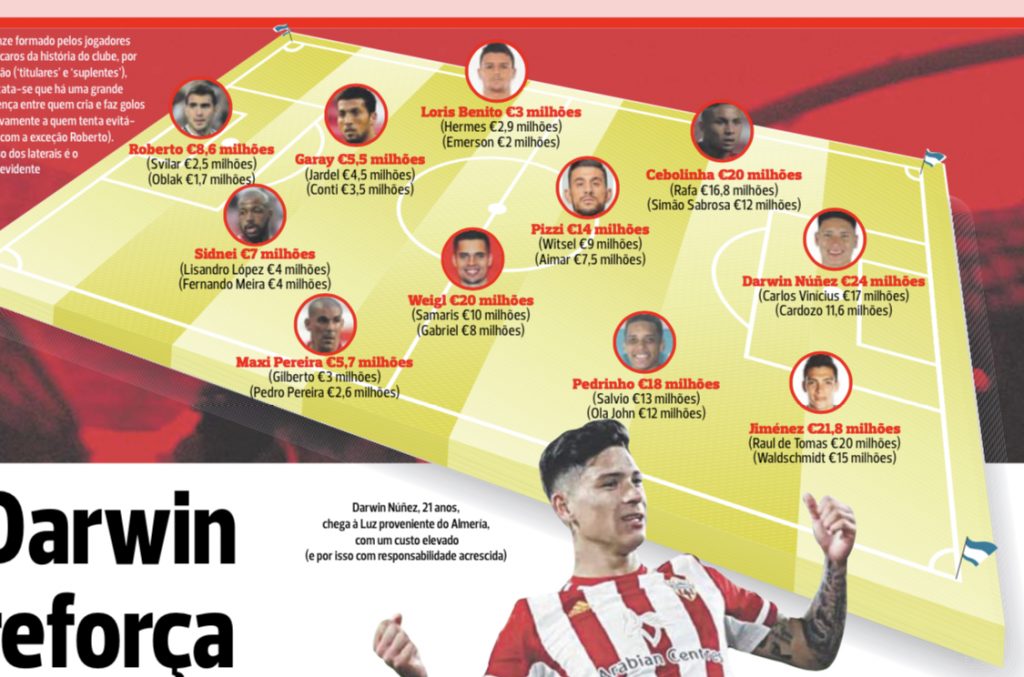 El portero del Real Valladolid Roberto Jiménez ha pasado en su carrera por multitud de equipos, uno de los clubes que realizó la apuesta más fuerte por él fue el Benfica en el año 2010 cuando le compraron por 8,6 millones de euros, cifra que ningún portero ha superado en dicho club. El diario A Bola ha publicado hoy el «11» más caro de la historia del Benfica y nuestro cancerbero se encuentra en él: Roberto (8,6 millones), Pereira (5,7), Loris (3), Garay (5,5), Sidney (7), Weigl (20), Pizzi (14), Cebolinha (20), Pedrinho (18), Jiménez (21,8) y Darwin Núñez (24).