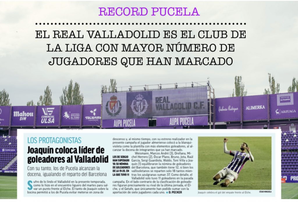 Con el estreno goleador de Joaquín Fernández en la presente campaña, el jugador almeriense colocó a la blanquivioleta como la plantilla con más elementos goleadores, al alcanzar la docena de integrantes que ya han marcado. De esta manera iguala a la plantilla del Barça que también tiene a 12 jugadores como goleadores y tal y como informa MARCA en su edición escrita, también supera a su propia cifra de la temporada pasada en la que anotaron 11.