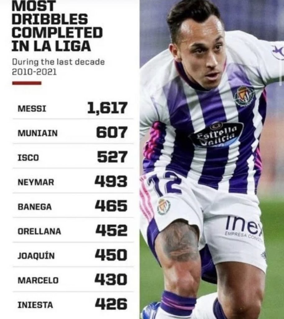 El atacante chileno del Real Valladolid Fabián Orellana se encuentra en el TOP-10 de los jugadores de la Liga de la última década que más regates han hecho. El actual futbolista del Real Valladolid se encuentra en el puesto 6 de este ranking entre los años 2010-2021. Solo ha sido superado por: Messi (1617), Muniain (607), Isco (527), Neymar (493) y Banega (465). Orellana cuenta con 452 regates y le siguen: Joaquín (450), Marcelo (430) e Iniesta (426).