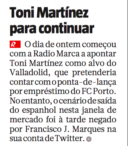 Hace una semana desde Radio Marca se informó que una de las opciones que se manejaba desde el Real Valladolid para reforzar la delantera era Toni Martínez, ex jugador del Pucela que se encuentra actualmente en las filas del Porto portugués. Desde la edición impresa del diario deportivo RECORD informan que el atacante no dejará el conjunto portugués, tal y como ha indicado el Director de Información y Comunicación del Porto Francisco J. Marques.