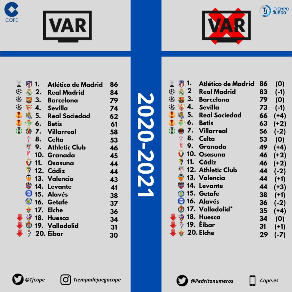 En la siguiente imagen del programa de Tiempo de Juego de la Cadena COPE podemos ver como el Real Valladolid se habría salvado sin la tecnología VAR. Su puesto lo habría ocupado el Elche, el Pucela sin VAR habría obtenido 35 puntos.