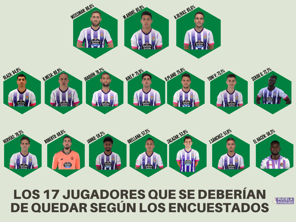 Desde Pucela Fichajes hemos querido conocer la idea que tiene el aficionado respecto a la plantilla, y a través de una encuesta hemos preguntado por los jugadores que deberían de quedarse en Zorrilla para la campaña 21/22, y estos han sido los resultados de los más votados: