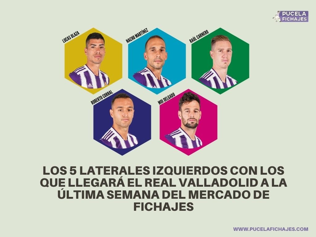 A principios de verano, el Real Valladolid contaba con 6 laterales zurdos, en los primeros días salió Ignasi Vilarrasa y desde entonces no ha vuelto a salir nadie en esa posición. A falta de poco más de una semana para que se cierre el mercado de fichajes, el Pucela cuenta con 5 jugadores que ocupan el puesto de lateral izquierdo: Lucas Olaza, Nacho Martínez, Raúl Carnero, Roberto Corral y Moi Delgado. Al menos de ellos saldrán esta semana, el Real Valladolid espera mantener a Olaza pese a que puedan llegar ofertas de última hora, y del resto de escucharán propuestas que puedan llegar.