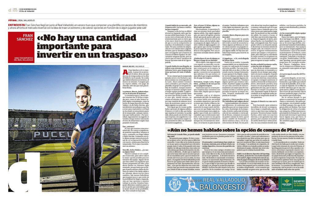 El director deportivo del Real Valladolid Fran Sánchez ha sido entrevistado en el Día de Valladolid y ha sido preguntado por los nombres de jugadores que han salido a la luz que podrían interesar al Pucela de cara a este mercado de invierno.