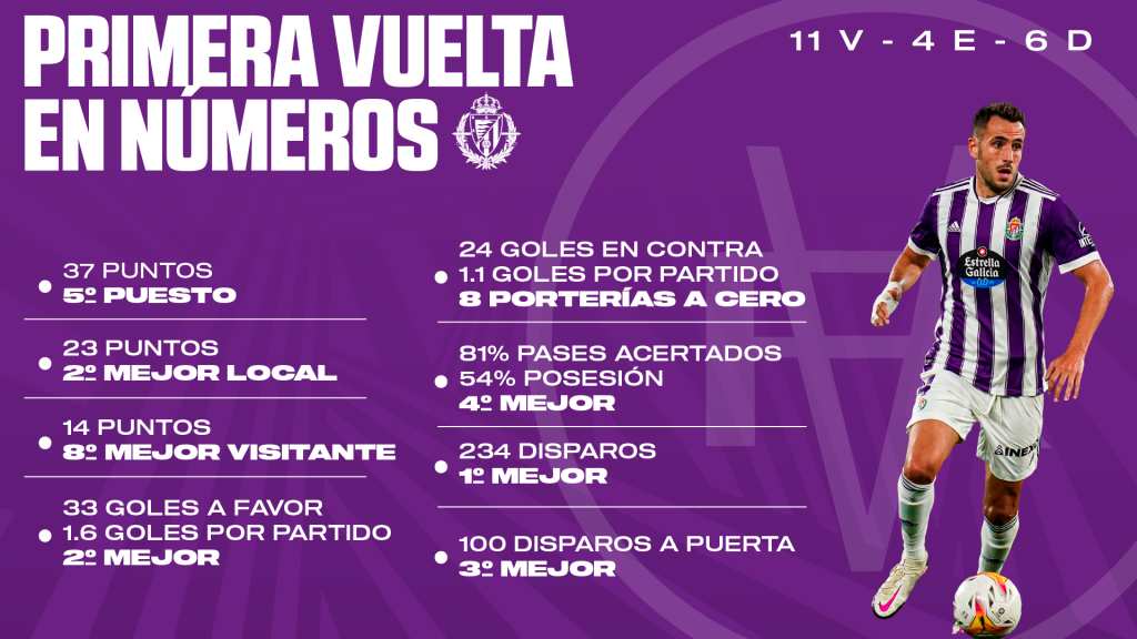 El Real Valladolid llega al ecuador quinto con 37 puntos, líder en disparos totales, segundo mejor local, y segundo máximo goleador de la categoría