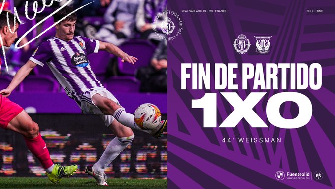 Con mucha voluntad y buenas ideas, aunque algo menos de precisión en el pase, el Real Valladolid imponía su ley. No obstante el equipo pepinero presionaba con acierto y a raíz de ahí puso en apuros a los locales en alguna acción, pero salvó la defensa. Más allá de un par de disparos lejanos que atrapó Masip no incomodó el cuadro madrileño, que se vio superado al filo del descanso cuando un centro largo al segundo palo fue prolongado por Nacho, mandando el balón al corazón del área pequeña ante la media salida del portero rival, para la llegada certera y contundente de un Weissman que suma ya 11 dianas en lo que va de curso.