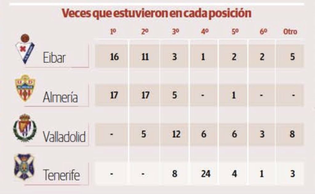 En la siguiente tabla de El Día de Tenerife se puede ver que el Almería ha estado 34 jornadas en total (17 como primero y 17 como segundo), el Eibar en 27 ocasiones (16 como primero y 11 como segundo), el Real Valladolid en 5 (todas como segundo) y el Tenerife no lo ha estado nunca.