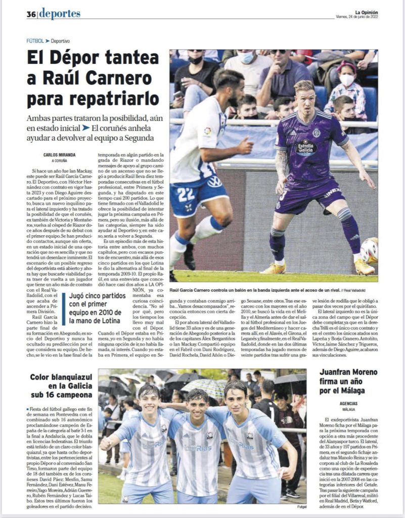 Una vez más un medio de comunicación confirma una noticia publicada en PUCELA FICHAJES, esta vez el diario La Opinión de Coruña informa del interés del Deportivo en el lateral zurdo del Real Valladolid Raúl Carnero. Desde el citado medio incluso utilizan el mismo titular que publicamos en nuestra web, además también señalan que: “Se han producido contactos, aunque sin oferta en un estado inicial de una operación que no es sencilla y que no tendrá un desenlace inminente. El escenario de un posible regreso del deportivista está abierto y ahora hay que buscarle viabilidad para traer de vuelta a un jugador que tiene un año más de contrato con el Real Valladolid”.