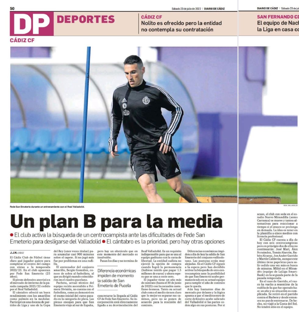 El Real Valladolid y Fede San Emeterio siguen sin llegar a un acuerdo para que el centrocampista salga del Real Valladolid en este mercado de fichajes, el club pucelano no quiere pagarle todo lo que está pidiendo el jugador para salir y de momento su salida se antoja complicada pese a que todas las partes saben que lo mejor es que deje de ser futbolista del Pucela. Desde el diario de Cádiz informan que el Cádiz sigue esperando, pero que ya manejan otras opciones por si su salida se dilatase en el tiempo.