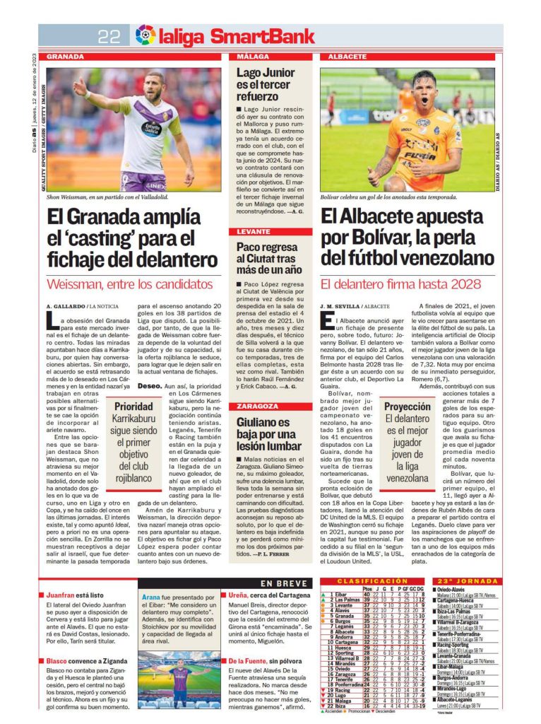Desde la edición impresa del diario AS se informa que Shon Weissman es uno de los candidatos para la delantera que más gusta al Granada, el jugador israelí prefiere seguir jugando en Primera, pero en las próximas semanas podría suceder cosas si sigue en la misma situación actual. Weissman junto a Karrikaburu es el favorito para reforzar la delantera del Granada.