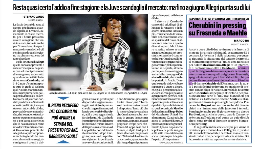 Uno de los “culebrones” del mercado de fichajes invernal del Real Valladolid está siendo el joven defensa Iván Fresneda, desde hace semanas se viene especulando desde la prensa que el jugador dejará el Pucela en enero para recalar en algún importante club europeo. Desde el diario deportivo TUTTOSPORT en su edición impresa señalan que el jugador podría dejar el Real Valladolid por la mitad de su cláusula: “La Juventus está especialmente atenta a la situación del lateral derecho que, única necesidad real para Massimiliano Allegri, un jugador de rol de Cuadrado. Los nombres sobre la mesa de la dirección deportiva blanquinegra pone máxima atención en el joven Iván Fresneda, jugador del Real Valladolid, el equipo español pide al menos 15 millones para que se produzca su salida”.