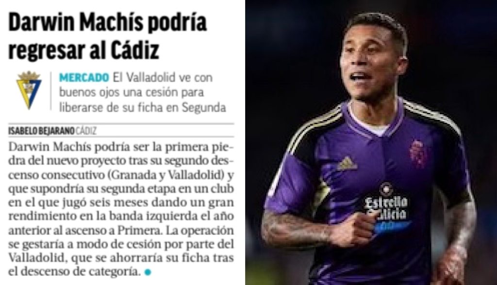 Las negociaciones entre Real Valladolid y Cádiz por Darwin Machis ya han comenzado, el Real Valladolid ve bien su salida a modo de cesión para así poderse liberar de su alta ficha para Segunda División tal y como se informa desde la edición impresa del diario MARCA. Las negociaciones no se han cerrado, ya que el Cádiz pretende pagar algo menos del salario del jugador, y de momento continúan las conversaciones para intentar llegar a buen puerto, las 3 partes entienden que lo mejor es que la operación se cierre lo antes posible.
