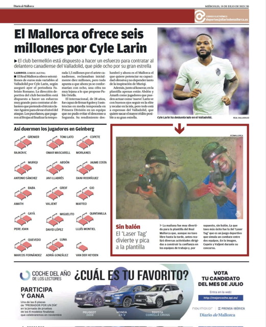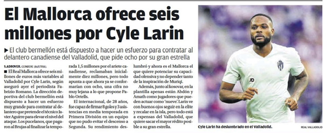 El Mallorca sigue detrás del atacante Cyle Larin, al Real Valladolid le ha llegado una oferta de 6 millones más variables, cantidad que a priori no será aceptada, ya que hasta hace unos días estaba pidiendo 10 millones por el atacante. Desde El Diario de Mallorca informan que el club pucelano habría rebajado sus pretensiones y podría salir por dos millones menos: “El club bermellón está dispuesto a hacer un esfuerzo para contratar al delantero canadiense del Valladolid, que pide ocho por su gran estrella. Los pucelanos reclamaban inicialmente diez millones, pero todo apunta a que ahora ya se conformarían con ocho, una cifra no muy lejana a lo que propone Pablo Ortells”.