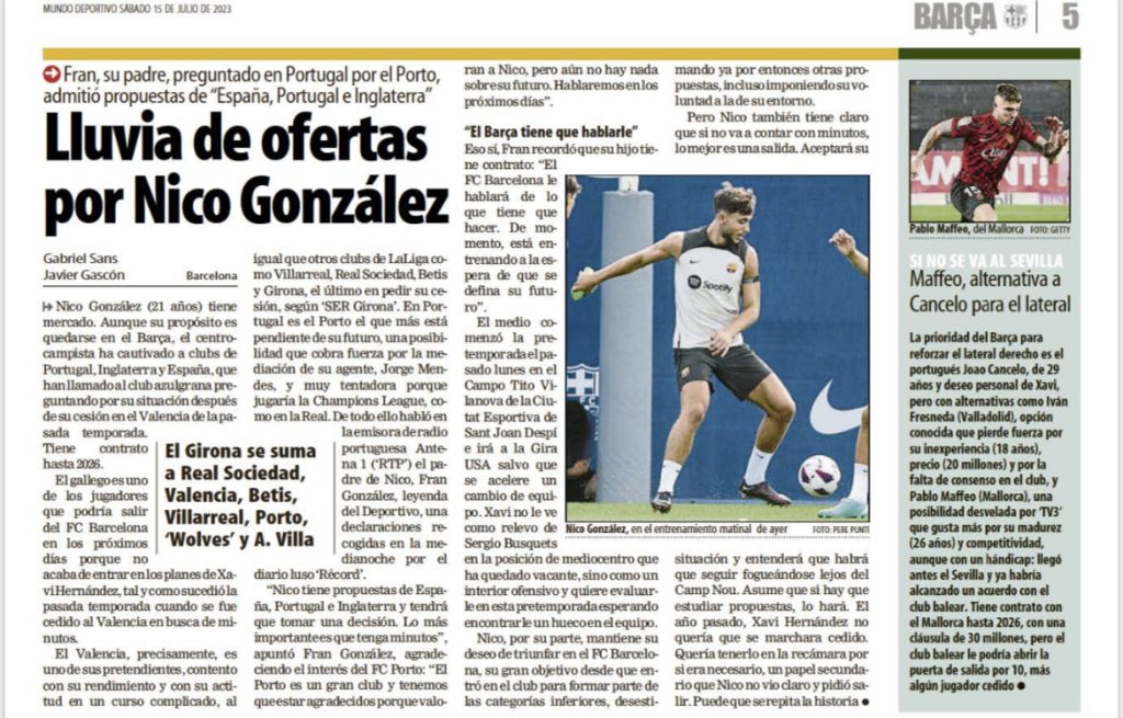 Pese a que Iván Fresneda es el candidato de Deco para reforzar el lateral derecho del Barcelona, su llegada a la ciudad condal se antoja complicada tal y como informa el diario MUNDO DEPORTIVO en su edición impresa: “La prioridad del Barça para reforzar el lateral derecho es el portugués Joao Cancelo, de 29 años y deseo personal de Xavi, pero con alternativas como Iván Fresneda (Valladolid), opción conocida que pierde fuerza por su inexperiencia (18 años), precio (20 millones) y por la falta de consenso en el dub, y Pablo Maffeo (Mallorca), una posibilidad desvelada por TV3* que gusta más por su madurez (26 años) y competitividad, aunque con un hándicap: llegó antes el Sevilla y ya habria alcanzado un acuerdo con el dub balear. Tiene contrato con el Mallorca hasta 2026, con una dáusula de 30 millones, pero el dub balear le podría abrir la puerta de salida por 10, más algún jugador cedido”.