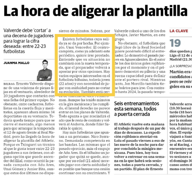 Desde la edición impresa del diario El Correo de Bizkaia se informa que el jugador quiere salir cedido en verano para disponer de más minutos: “Existen futbolistas cuya salida ya se da por hecha. Por ejemplo, Unai Vencedor. El centrocampista, como ya adelantó este periódico, quiere irse prestado. Entiende que su situación no cambiará con la nueva temporada, que el preparador volverá a apostar por otras opciones. Hay varios equipos interesados en el futbolista bilbaíno, todavía joven (22 años) y con necesidad de jugar con asiduidad para no cortar su evolución”.