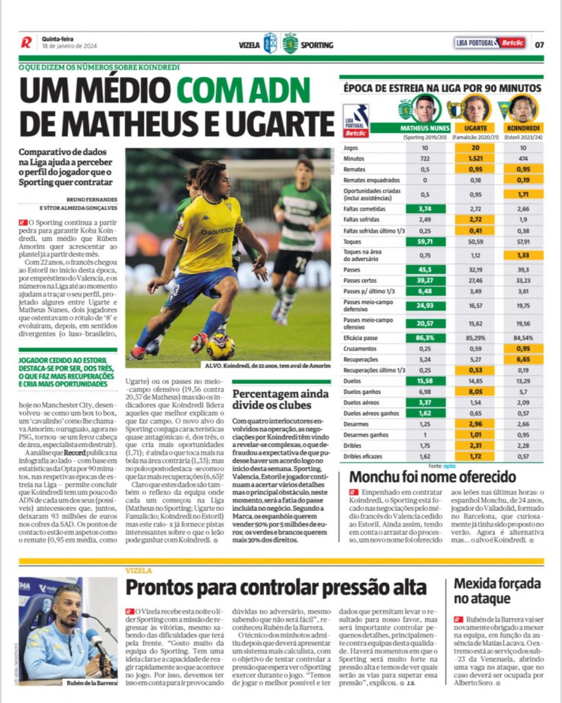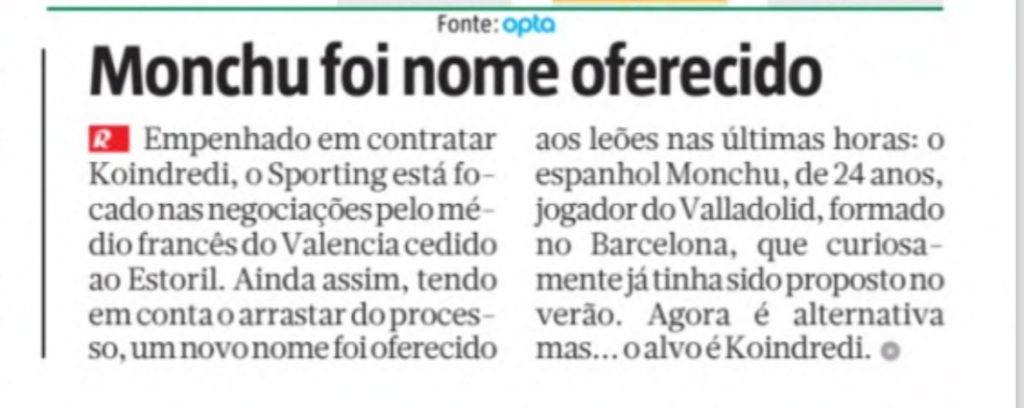 Ayer desde el diario O JOGO se informaba que el jugador Monchu estaba en la órbita del Sporting Portugal, hoy desde RECORD señalan que ha sido un ofrecimiento, que gusta al club luso pero que no se trata de la primera prioridad para el Sporting: “Monchu fue el nombre ofrecido. Comprometidos con la contratación de Koindredi, el Sporting está centrado en las negociaciones por la cesión del centrocampista francés del Valencia al Estoril. Aun así, teniendo en cuenta lo largo del proceso, en las últimas horas se ha ofrecido un nuevo nombre a los leones: el español Monchu, de 24 años, jugador del Real Valladolid, formado en el Barcelona, que curiosamente ya había sido propuesto en el verano. Ahora es una alternativa pero… el objetivo es Koindredi”.