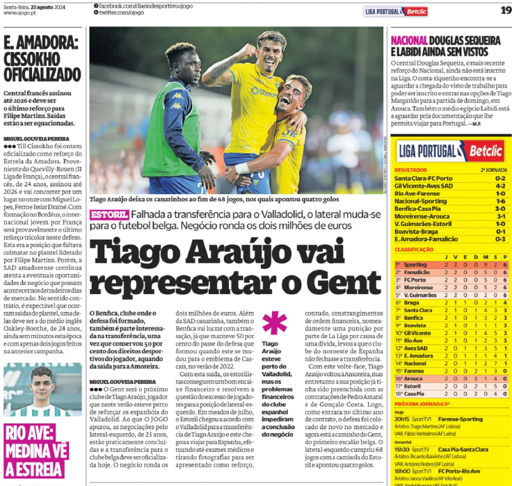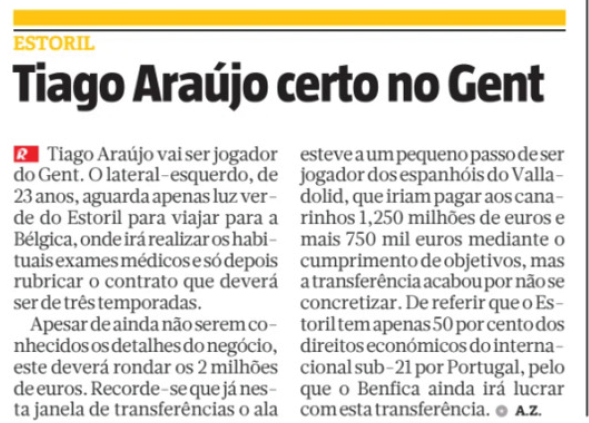 El fichaje frustrado del Real Valladolid Tiago Araujo cambiará de equipo en las próximas horas, desde el diario O JOGO informan que fichará por el Gent y dejará 2 millones de euros en las arcas del Estoril, el citado medio señala que su fichaje por el Real Valladolid se truncó por los problemas económicos del equipo blanquivioleta que impidieron finalizar el acuerdo entre clubes.
